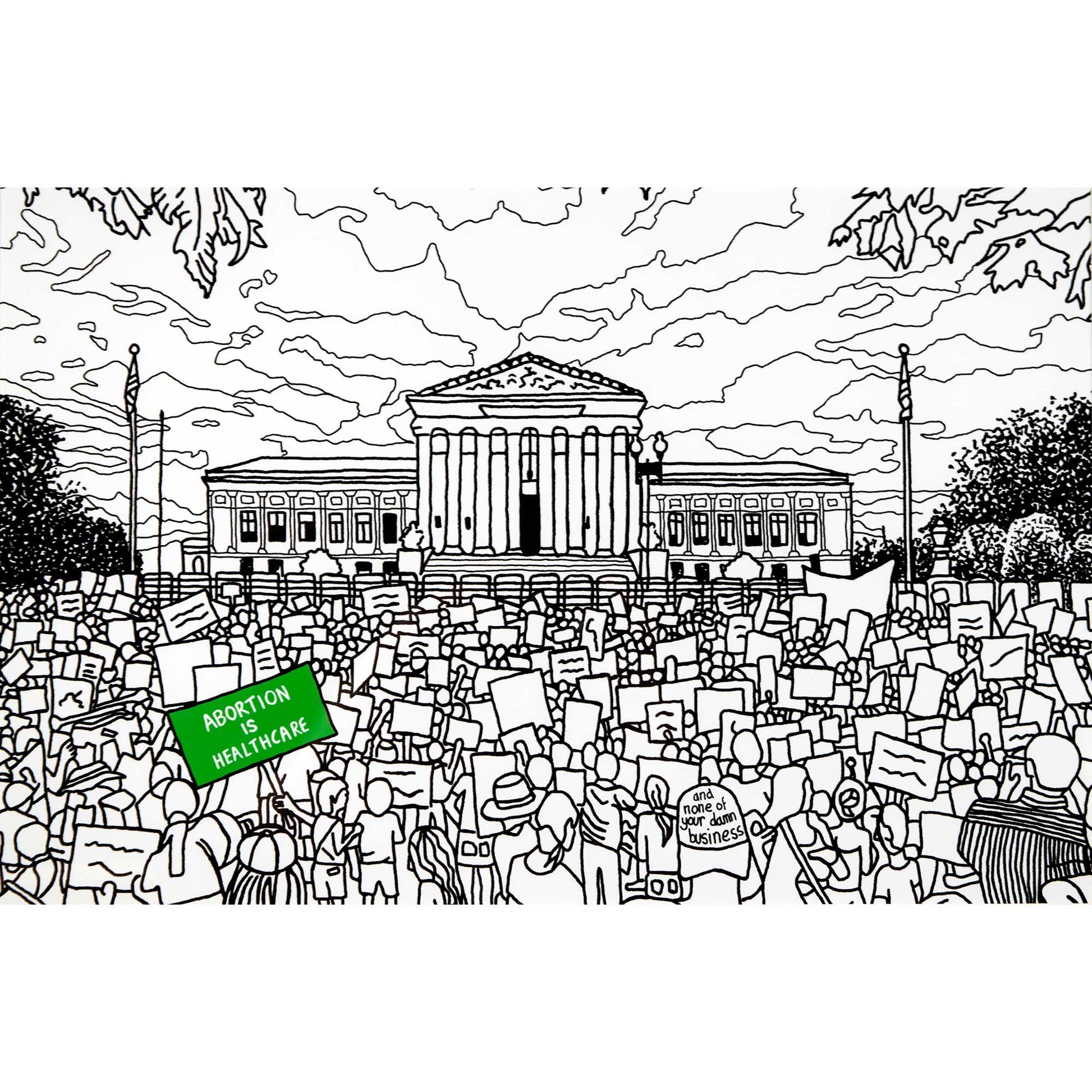 Dibujé esta imagen con pluma y tinta de cientos de personas expresando su desesperación frente a un SCOTUS cercado para conmemorar ese día. El mensaje es claro: el aborto es atención médica y no es asunto tuyo.