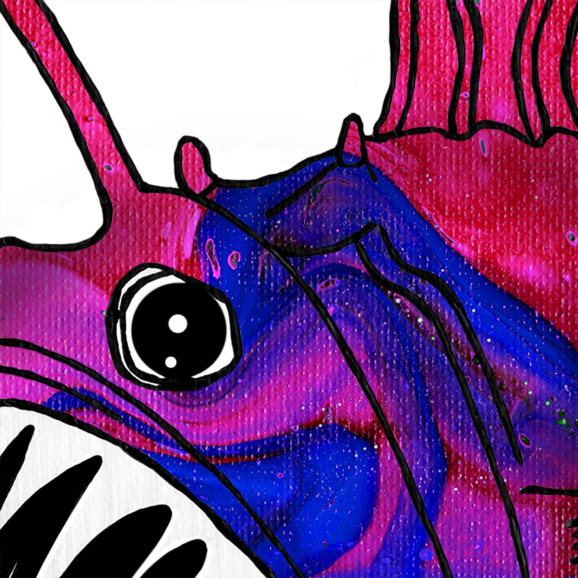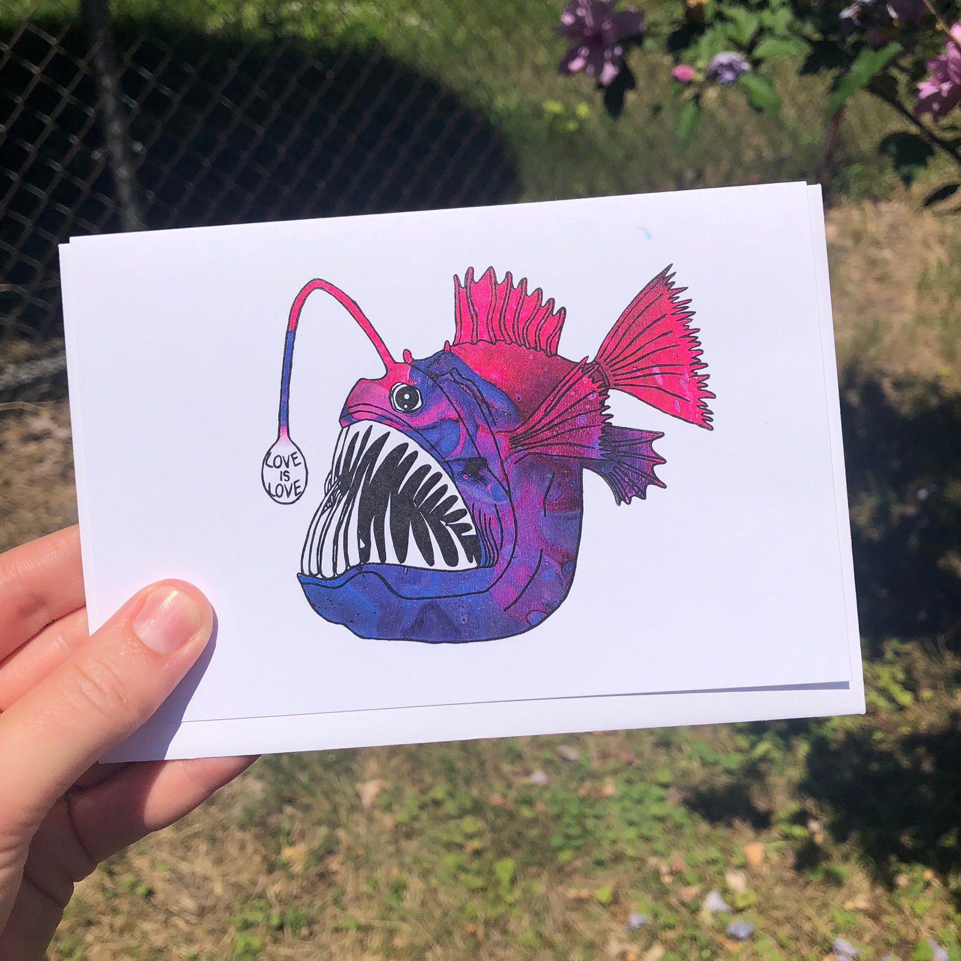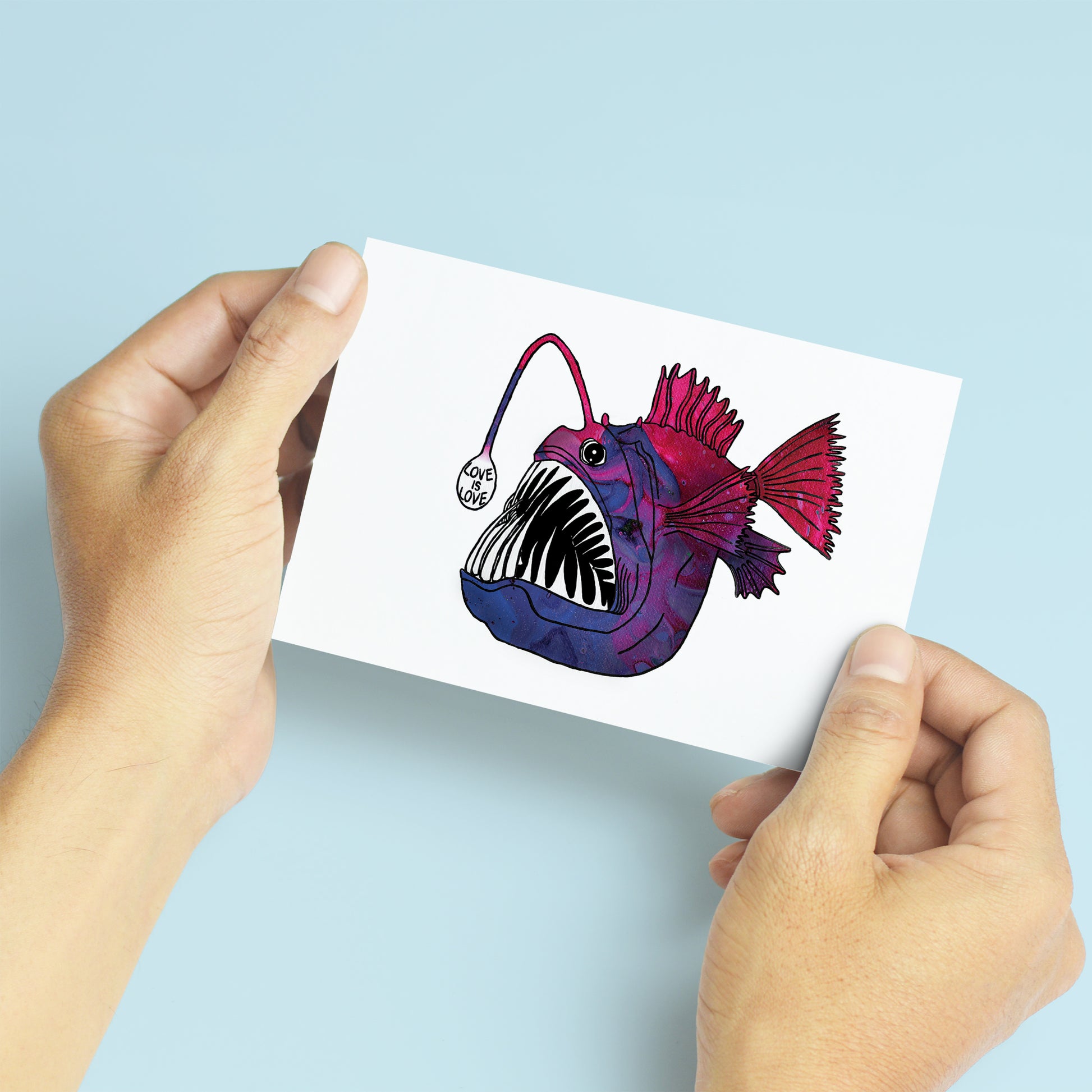 Creé este diseño de tarjeta de felicitación 'Love Is Love' usando una técnica de vertido de pintura acrílica para lograr un efecto de arcoíris fluido. Esta es una copia de mi pintura original, que forma parte de una serie de criaturas de las profundidades marinas sosteniendo carteles de protesta que dicen "El amor es amor".