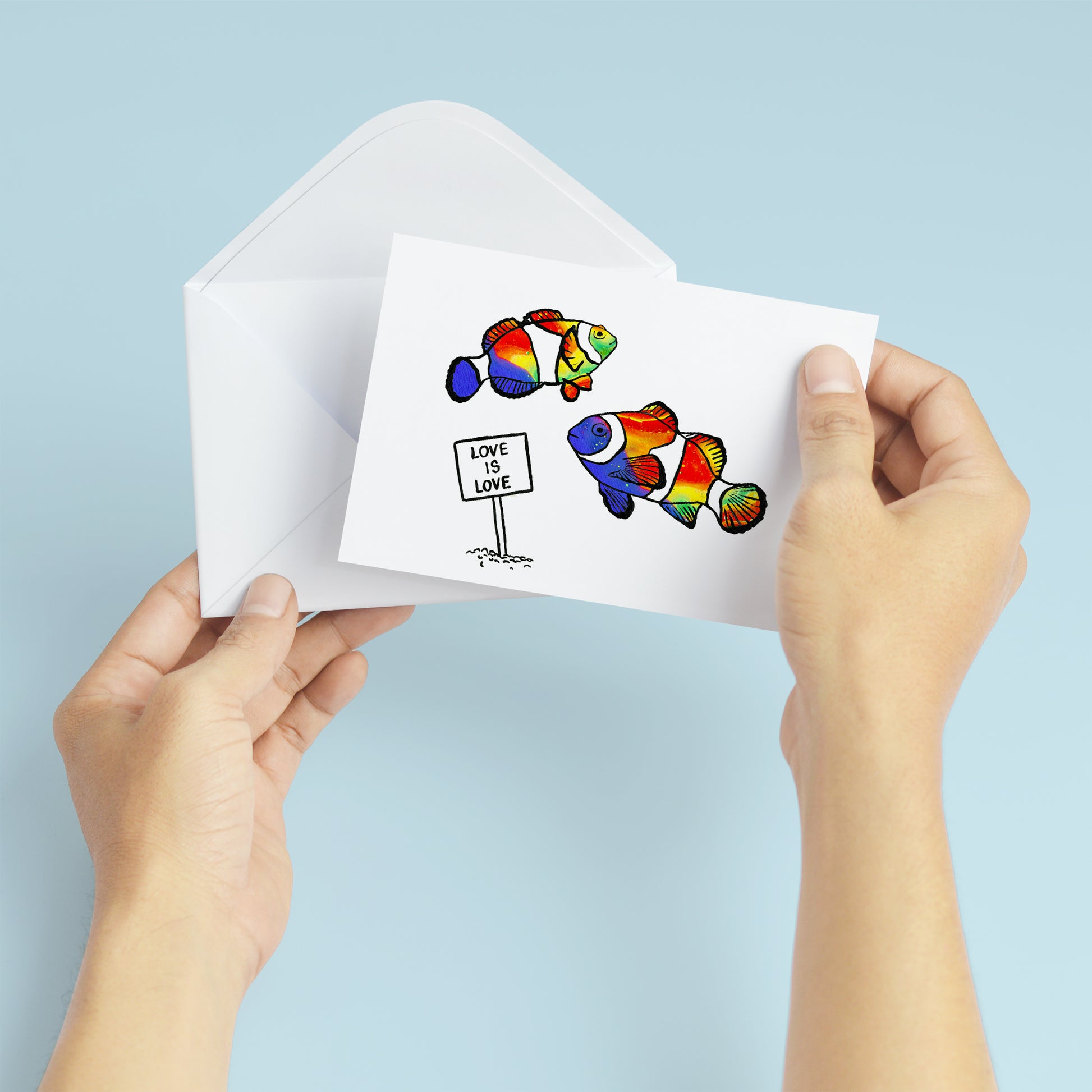 Tarjeta de felicitación en blanco con pez payaso 'Love Is Love'