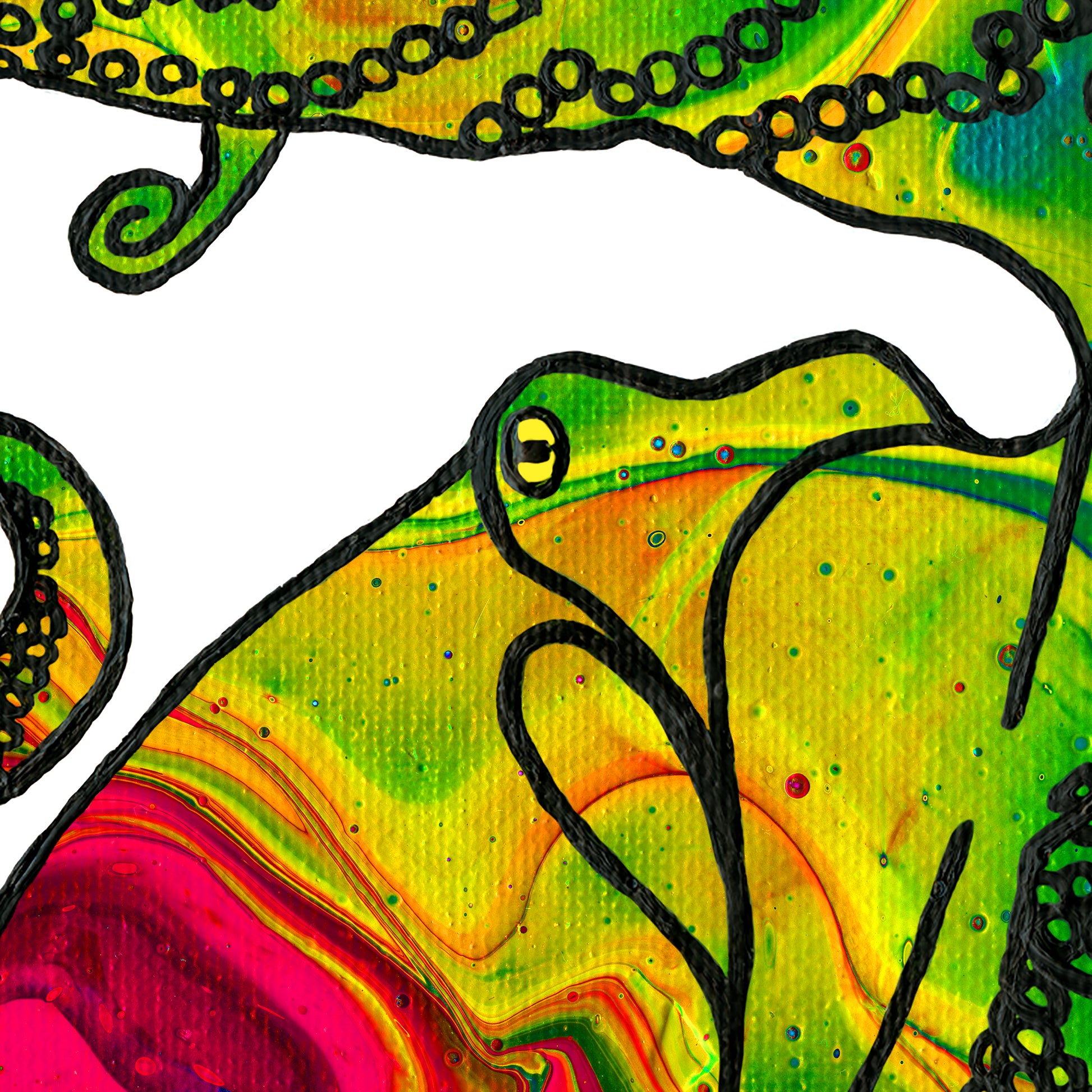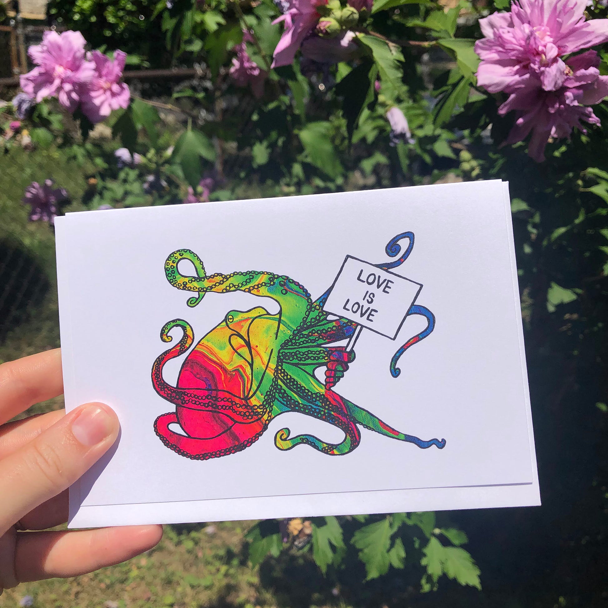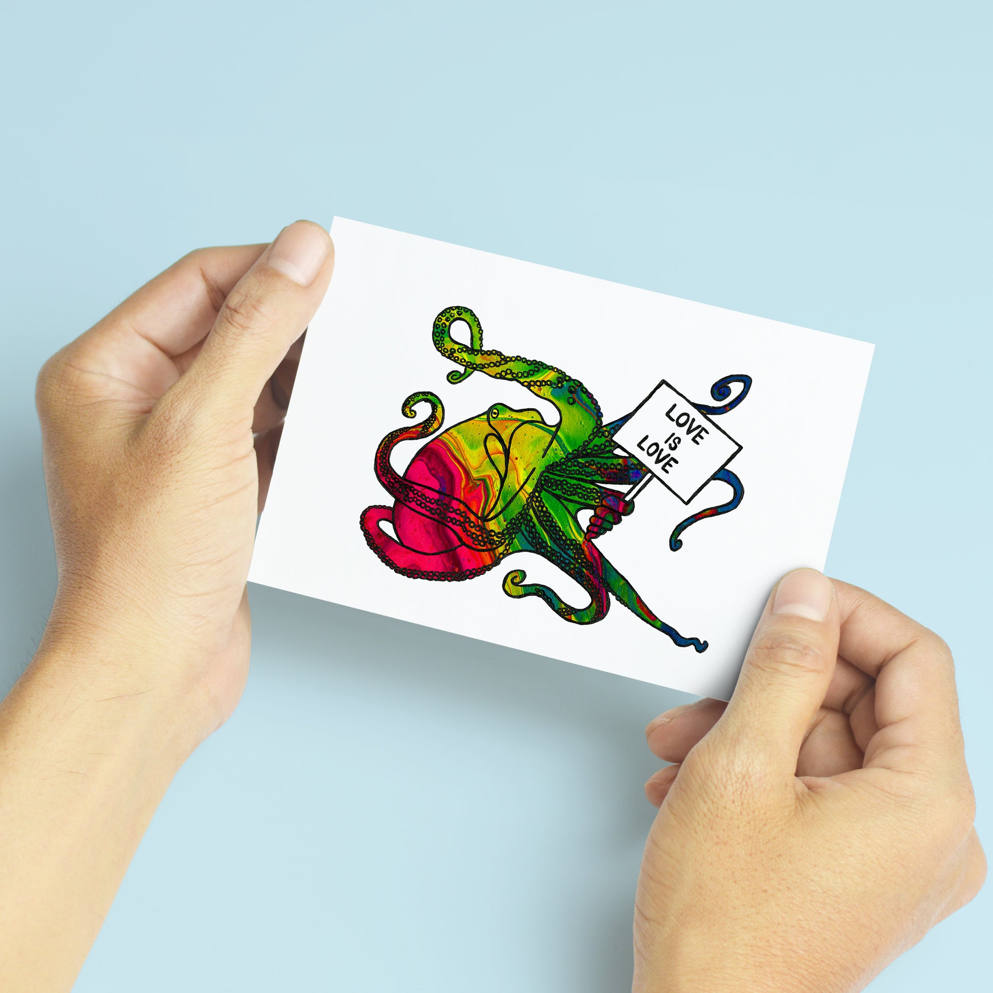 Creé esta tarjeta de felicitación en blanco 'Love Is Love' usando una técnica de vertido de pintura acrílica para lograr un efecto de arcoíris fluido. Esta es una copia de mi pintura original, que forma parte de una serie de criaturas de las profundidades marinas sosteniendo carteles de protesta que dicen "El amor es amor".