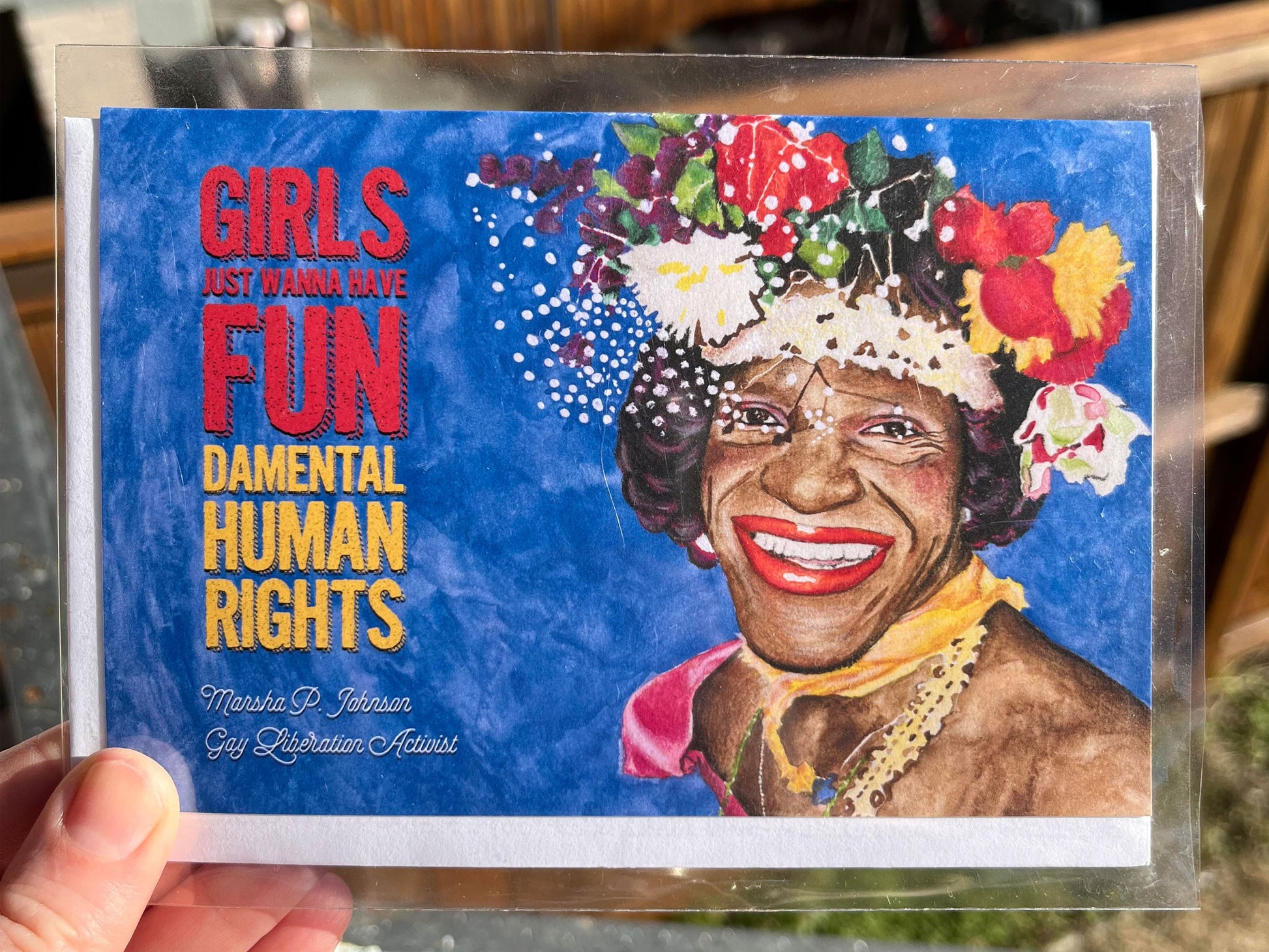 Esta tarjeta de felicitación 'Girls Just Wanna Have Fundamental Human Rights' presenta a la activista estadounidense de liberación gay, autoidentificada drag queen e ícono del levantamiento de Stonewall, Marsha P. Johnson.