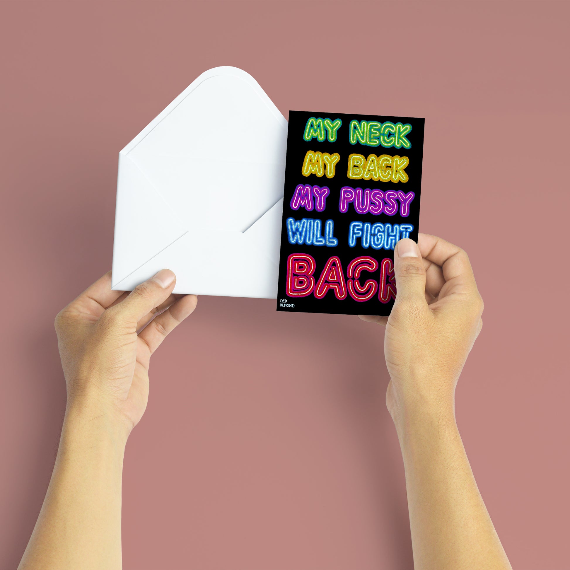 Estas tarjetas de felicitación en blanco 'Mi cuello, mi espalda' son una versión del éxito de Khia de 2001 y un cartel de protesta popular en las marchas de mujeres. Están creados a partir de mi dibujo original de letras de neón usando lápices pastel.