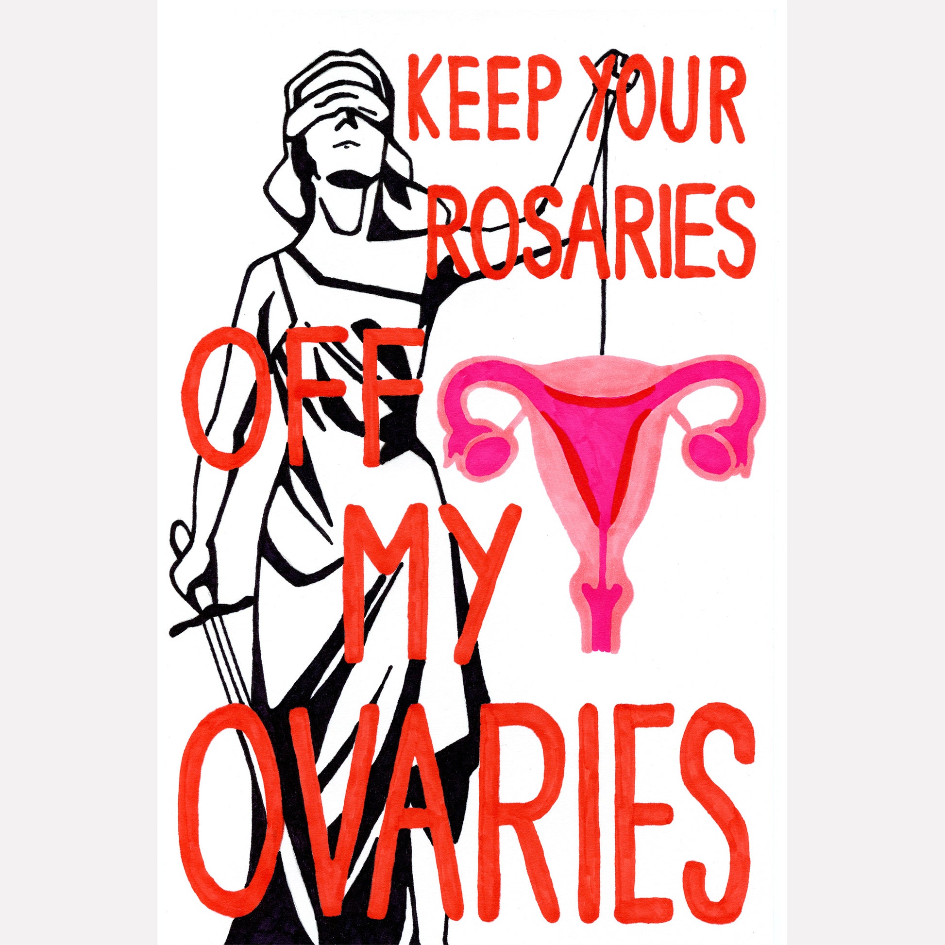 This is a print of Lady Justice holding a uterus and ovaries in defiance of the attacks on the reproductive rights.