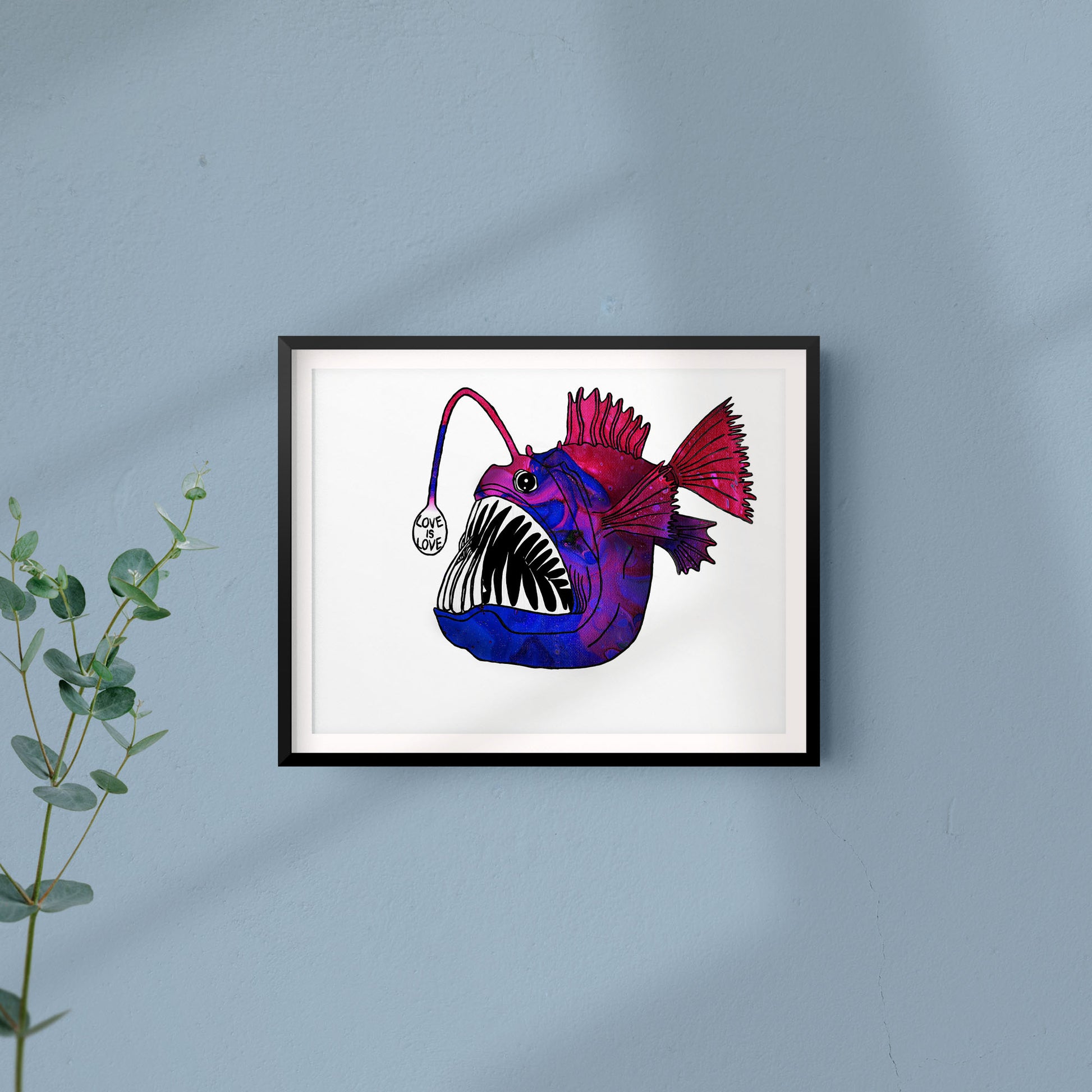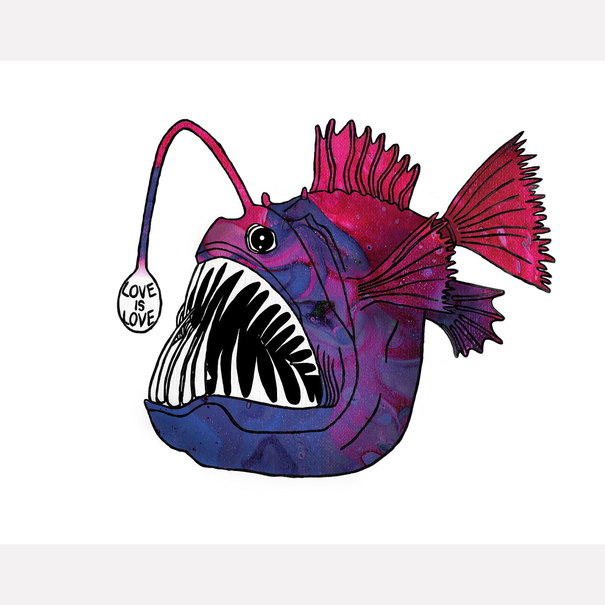 I created this 'Love Is Love' protest sign art using an acrylic paint pouring technique for a fluid rainbow effect. This is a print of my original painting, which is part of a series of deep sea creatures holding up ‘Love Is Love’ protest signs.