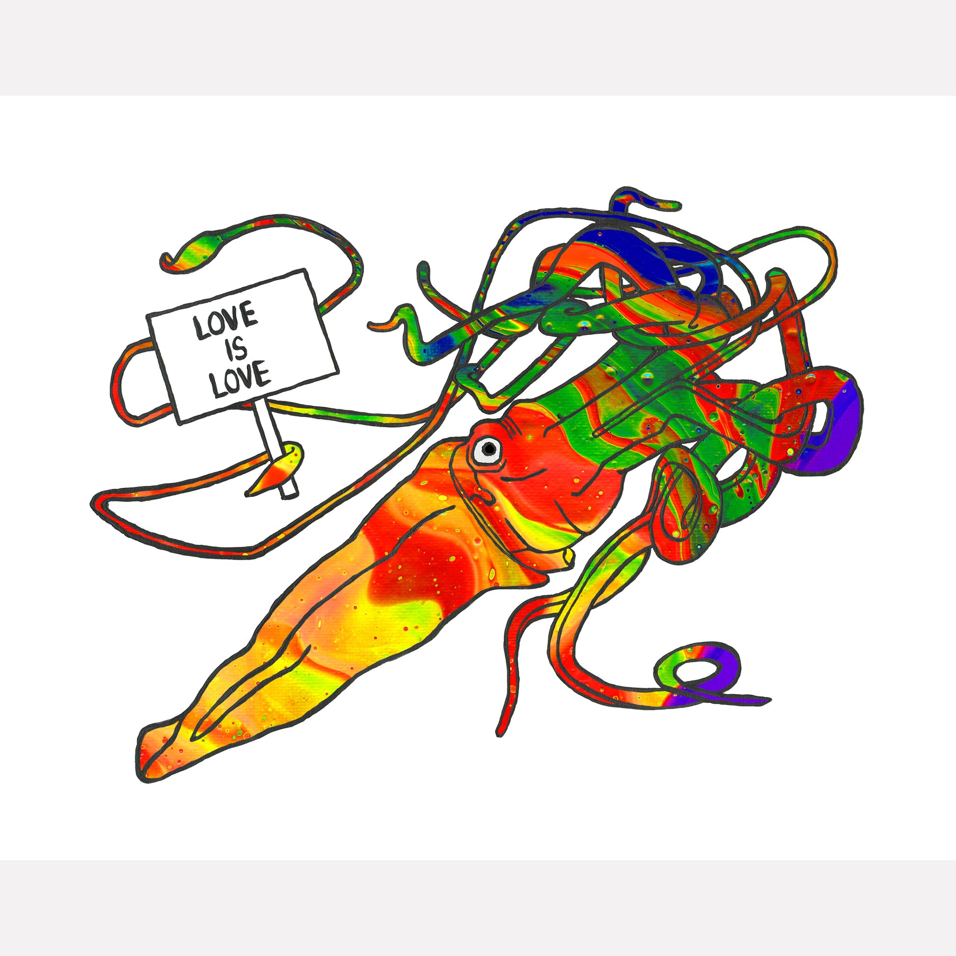 I created this 'Love Is Love' protest sign art using an acrylic paint pouring technique for a fluid rainbow effect. This is a print of my original painting, which is part of a series of deep sea creatures holding up ‘Love Is Love’ protest signs.