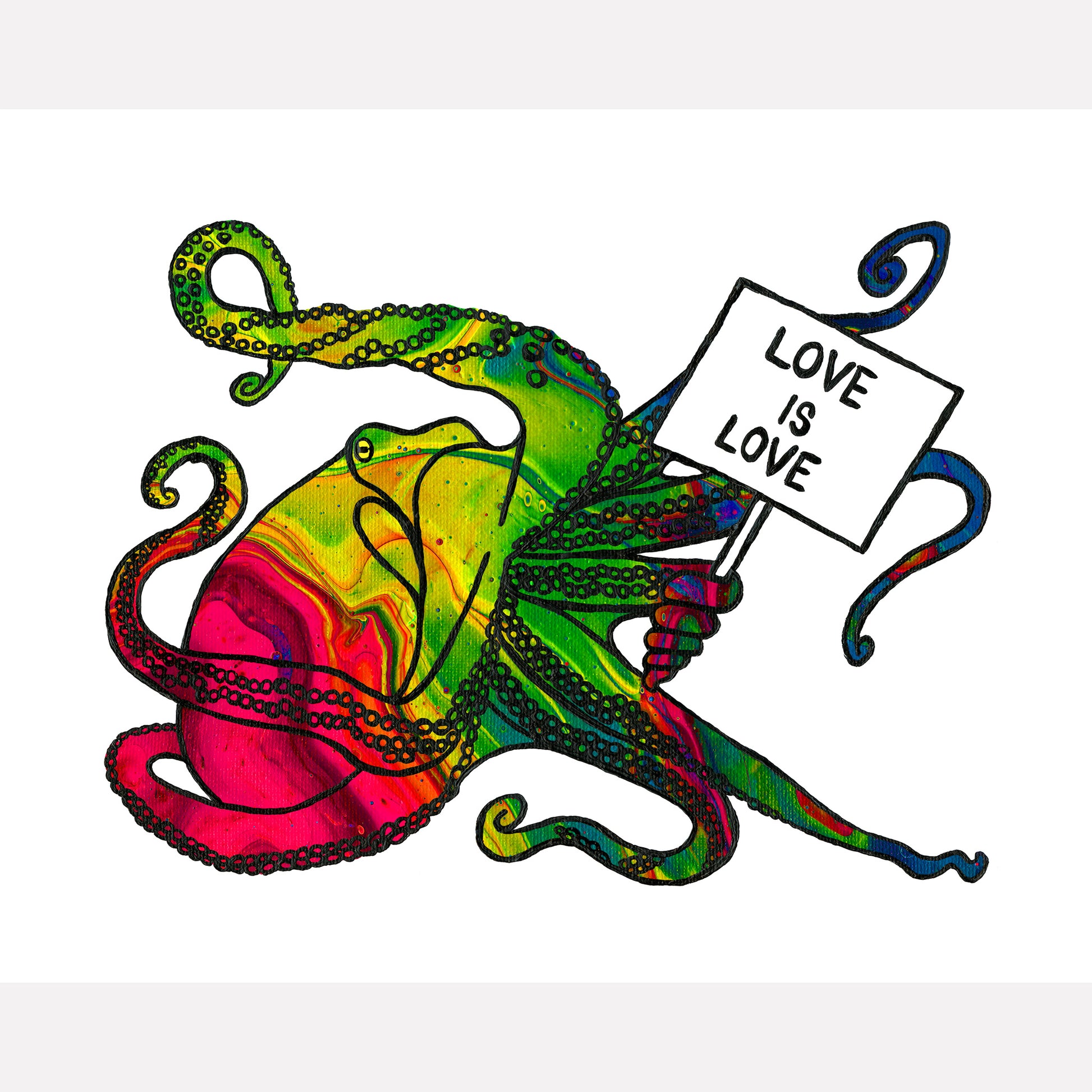 I created this 'Love Is Love' protest sign art using an acrylic paint pouring technique for a fluid rainbow effect. This is a print of my original painting, which is part of a series of deep sea creatures holding up ‘Love Is Love’ protest signs.