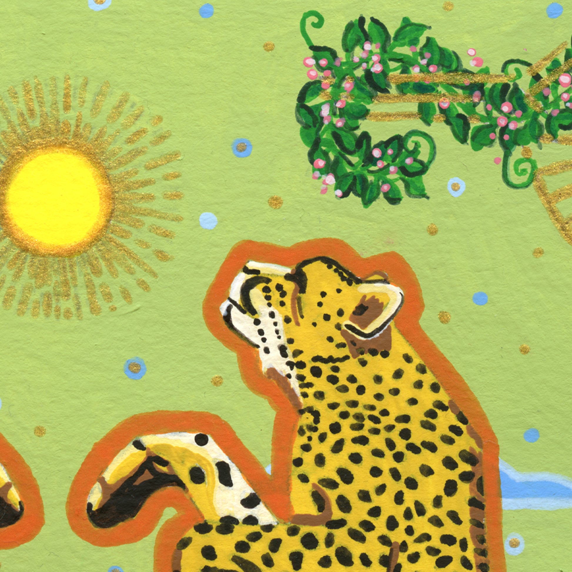 'Cheetahs & Cactus' is the second painting from the forthcoming 'Pussy Cat Collection'. This painting is a nature inspired interpretation of the vulva in calming colors and desert terrain. It may be dry (at the moment) but it's full of luscious life and pink accents. The cactus' roots are strong and anchored, and the cheetah's gaze is placed firmly on the sun.