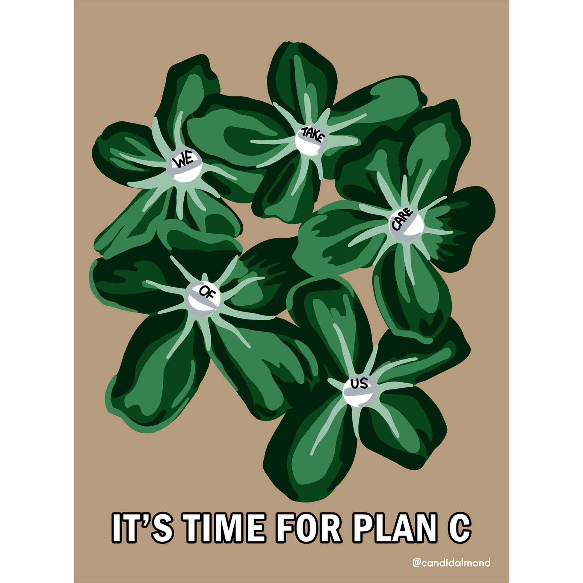 In this digital protest poster, the center of each green flower is one of the five abortion pills that someone can take at home to end a pregnancy up to 11 weeks. Visit Plan C for more information.
